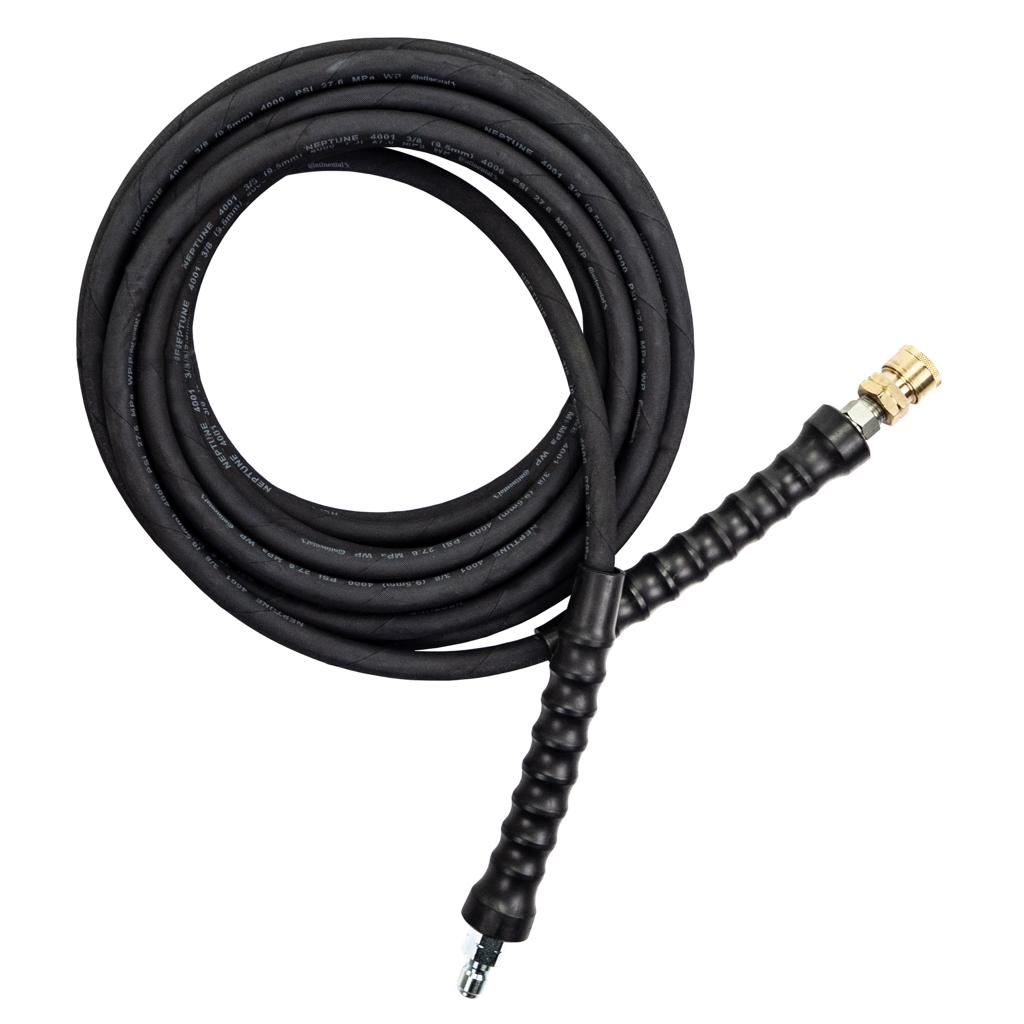 8″ QR - Schlauchlänge (Fuß/m) : 40 / 12.2 5/16″ 4000PSI stahlumwickelter Gummischlauch - Düsen : 0, 15, 25 & 40 Grad; Standard Seifendüse - Kraftstofftankkapazität (l) : 3.6 - Abmessungen (mm)(LxBxH : 625 x 505 x 600